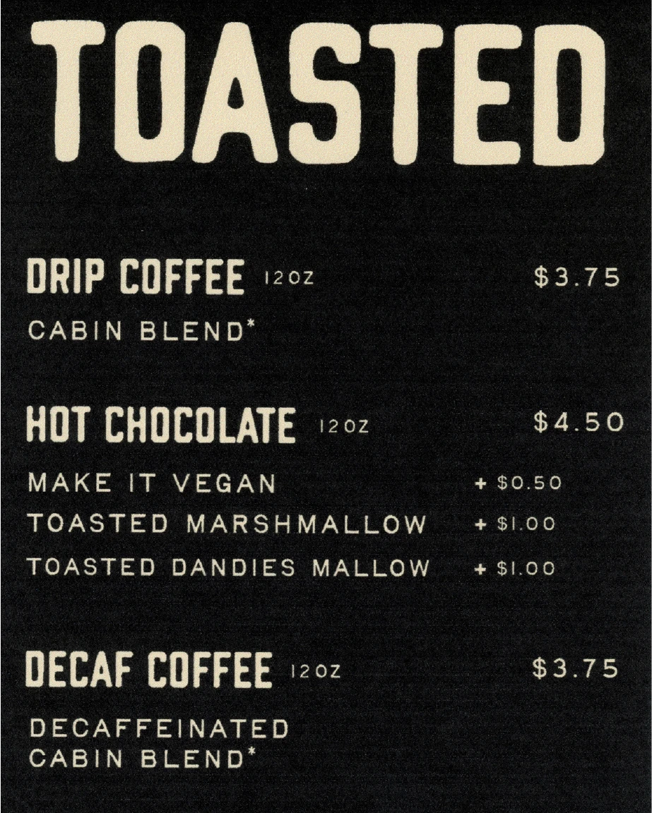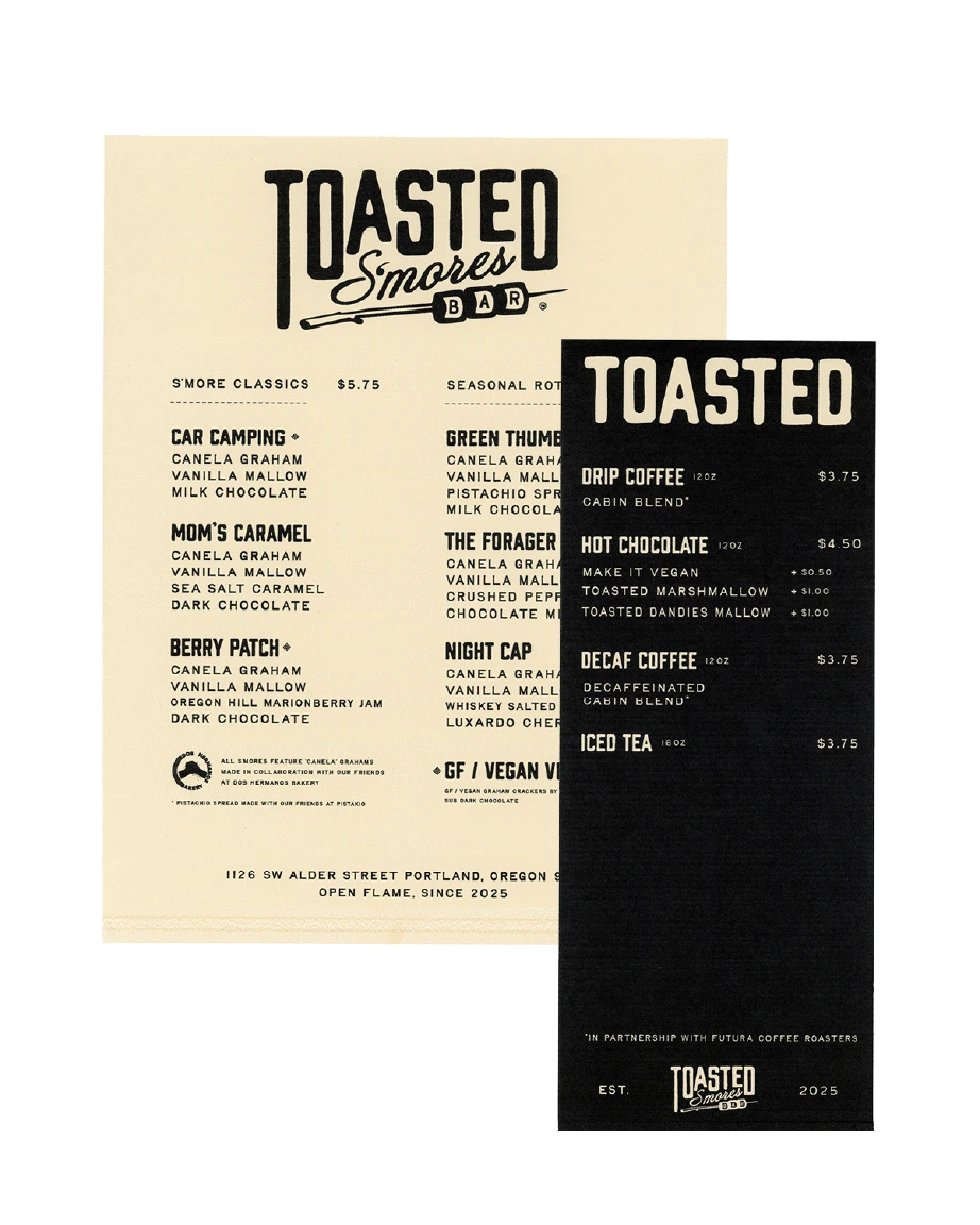 This project necessitated a tight turnaround, and on a condensed timeline AS IS* conducted a three stage brand identity development process. An exploration phase proposed a range of identity directions. Based on client feedback a several round revision process was carried out to reach final logo marks and core brand copy. These assets were then applied to shop infrastructure and menus. This entire process was completed in under three weeks.